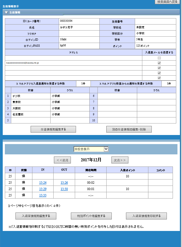 この画面から生徒情報の編集はもちろん、入退室情報の編集や特別ポイントの編集も行うことができます。